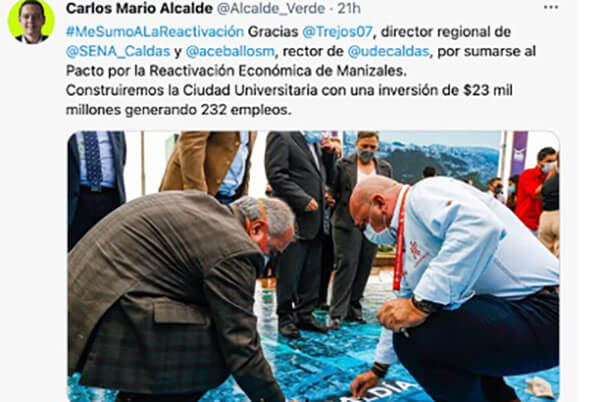 "Nos sumamos a este plan de ciudad a través de los servicios que puede ofertar nuestra Entidad al ecosistema empresarial de la ciudad, robustecerlo con nuestros profesionales del Centro de Desarrollo Empresarial y las posibilidades que brindan las convocatorias de Fondo Emprender y las iniciativas vigentes de la Dirección de Empleo, Trabajo y Emprendimiento como lo son Mipyme de Transforma y SENA Innova", explicó Jaime Trejos Londoño, director (e) del SENA Caldas quien estuvo en el acto simbólico.