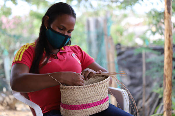 "Hoy contamos con una unidad productiva llamada 'El triunfo emprende' en el que tejemos mochilas en palma de Iraca sobre pedido. También hacemos manillas y productos para el hogar en madera MDF", explica Katherine Cortés Aguilar, integrante del equipo de mujeres emprendedoras.