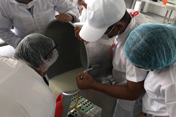 " La integralidad en los procesos formativos nos conduce a generar espacios pedagógicos para transformar en nuevos productos, lo que se produce en la granja, es así como con los aprendices estamos elaborando derivados lácteos con la leche que se obtiene de las vacas que a diario se ordeñan en las prácticas de Producción Ganadera", señala el instructor Rafael Fajardo.