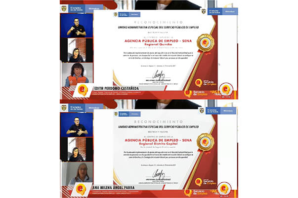 Las Agencias Públicas de Empleo del SENA de las Regionales Distrito Capital y Quindío recibieron este reconocimiento por contar con instalaciones accesibles con diseño universal, personal calificado en atención a la población con discapacidad y con videos explicativos con lenguajes de señas colombianas, entre otros.