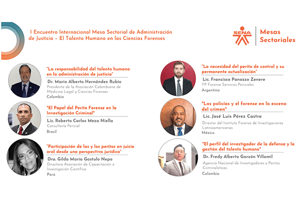 El encuentro contó con 2 invitados nacionales y 3 internacionales quienes explicaron y ampliaron los conocimientos sobre las ciencias forenses y su labor en los procesos criminalísticos; Mario Alberto Hernández Rubio, presidente de la Asociación Colombiana de Medicina Legal y Ciencias Forenses, experto nacional, fue enfático en la responsabilidad que se debe tener desde la enseñanza y el compromiso para escoger el talento humano en el sector de la administración de justicia mucho mas allá de verse como un negocio lucrativo.