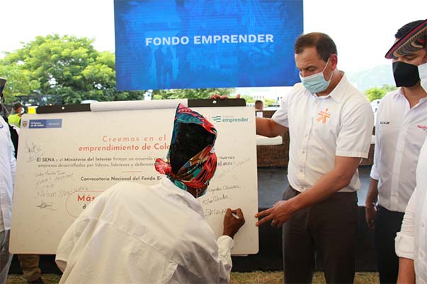 "Hicimos la firma de un nuevo convenio del Fondo Emprender destinado para los líderes sociales y defensores de Derechos Humanos en nuestro país; y que bueno que junto al SENA podamos estar diciendo que esa política diferencial del Gobierno se manifiesta en iniciativas como estas", aseguró el Ministro del Interior, Daniel Palacios Martínez.