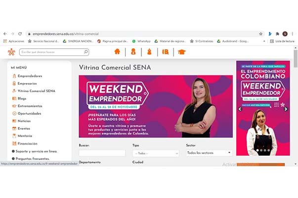 Con el objetivo de contribuir al fortalecimiento de la cultura creativa y el espíritu emprendedor del país, así como impulsar la reactivación económica, la Entidad realizará la primera feria virtual y comercial 'Weekend Emprendedor', donde emprendedores de todas las regiones de Colombia podrán ofrecer sus productos y servicios de forma gratuita a través de la Red de Emprendedores que tiene la Entidad en emprendedores.sena.edu.co