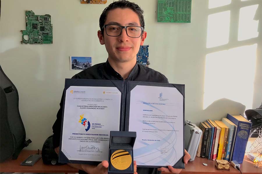 El joven investigador del SENA regional Boyacá, Juan Esteban Merchán Balaguera, ganó el XII Premio Nacional al Inventor Colombiano 2022, en la categoría Investigador Individual que entrega la Superintendencia de Industria y Comercio. También recibió el premio de la Organización Mundial de la Propiedad Intelectual – OMPI-, una medalla concedida a los inventores de esa categoría.