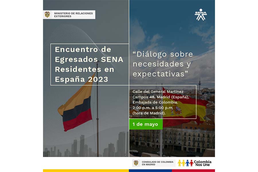 Adicionalmente, el lunes 1 de mayo se efectuará un importante evento en la misma Embajada de Colombia en Madrid (Calle del General Martínez Campos 48), desde las 2:00 p. m. hasta las 5:00 p. m., con el propósito de socializar el portafolio de servicios dirigido a los egresados del SENA residentes en España, y de consolidar información relacionada con sus necesidades y expectativas.
