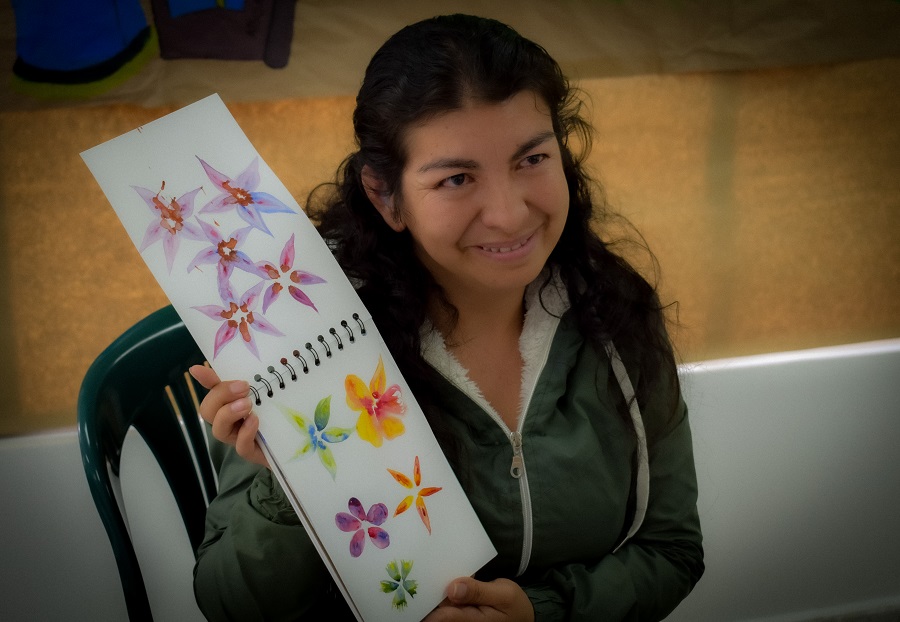 Leidy Montenegro, aprendiz con discapacidad auditiva, crea figuras con acuarela.